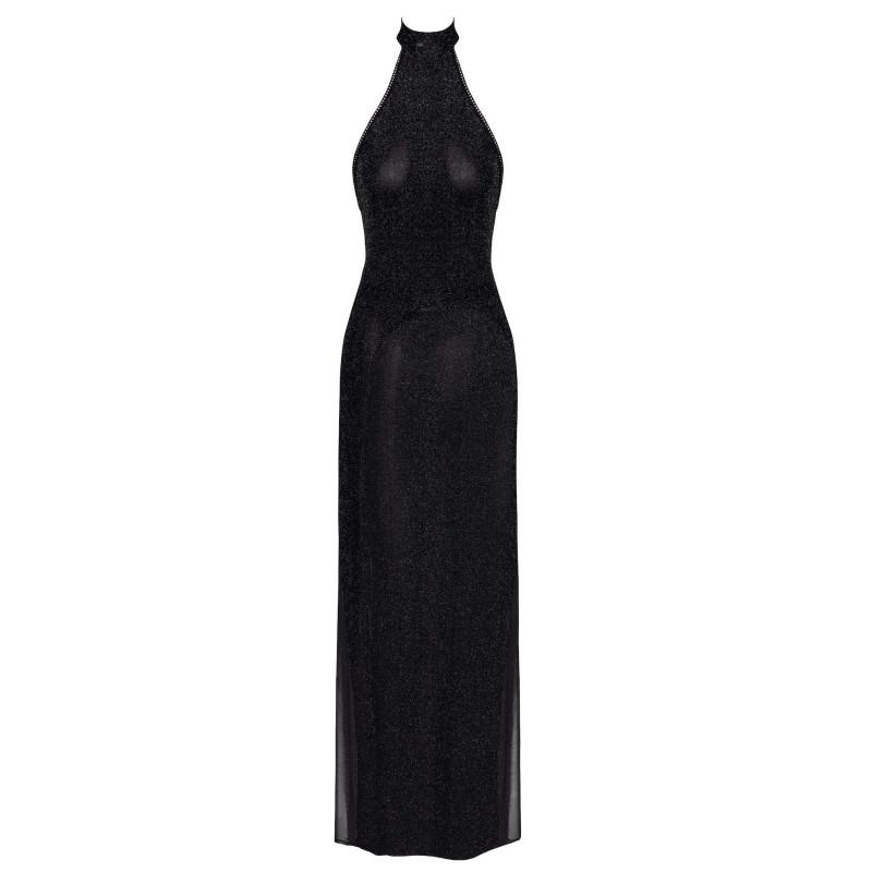 Envuélvete en la magia del tul brillante con este vestido negro largo de hilos plateados. Su escote alto y su espalda descubierta con tira de pedrería capturan la atención, mientras las aberturas laterales revelan una sensualidad pura. Ideal para noches de poder y deseo, donde tú eres el centro de todas las miradas.