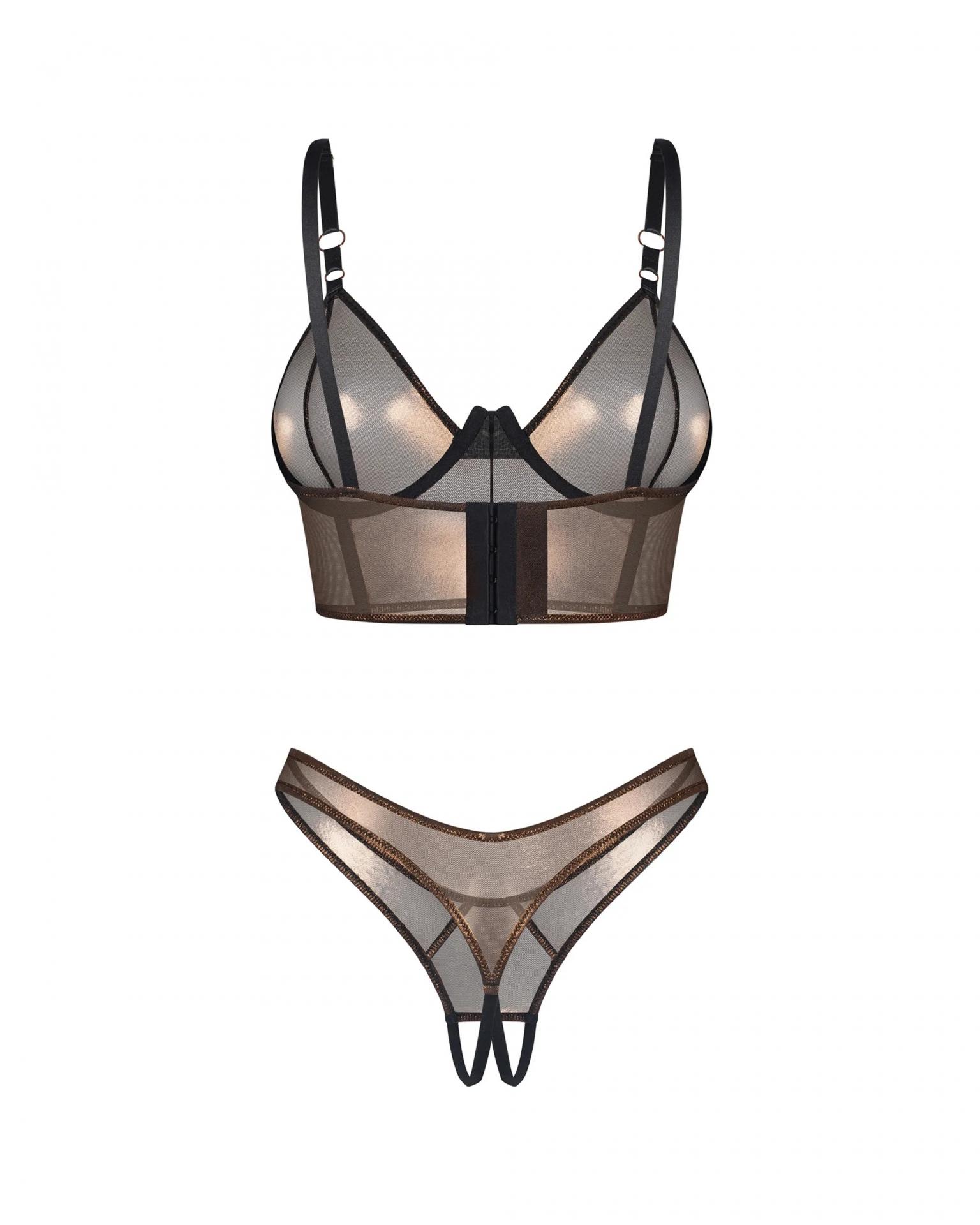 Una sensual mezcla de ligereza y audacia, envuelve la piel con una malla dorada transparente que juega con la luz y las formas del cuerpo. Su diseño ceñido celebra cada curva, mientras los aros del top elevan el busto y las varillas verticales dibujan una silueta irresistible. El tanga con entrepierna abierta añade ese toque atrevido que despierta deseo y empoderamiento. Ideal para noches donde la pasión se viste de lujo, este conjunto transforma la feminidad en arte y la sensualidad en poder.