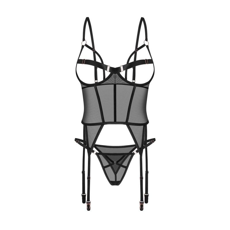 El conjunto combina la fuerza del deseo con la suavidad del tacto. Su corsé negro de líneas modernas, confeccionado en una malla elástica y ligera, abraza el cuerpo con un equilibrio perfecto entre firmeza y libertad. Las copas abiertas revelan una sensualidad elegante, mientras los detalles metálicos en oro rosa añaden un toque de lujo sutil. La tanga decorativa con cinturilla ajustable completa un conjunto diseñado para mujeres que no temen ser el centro de atención, seguras de su poder y feminidad.