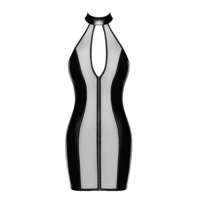 Este minivestido de tul y efecto cuero es una fantasía hecha realidad: provocador, brillante y con un diseño que resalta cada curva. Su tejido semitransparente combina con el acabado efecto cuero, mientras una cinta de pedrería recorre el centro delantero y trasero para añadir un toque lujoso e hipnótico. El escote alto con cierre de gancho y el corte sin mangas crean una silueta moderna y poderosa, perfecta para noches en las que la confianza y el deseo mandan.