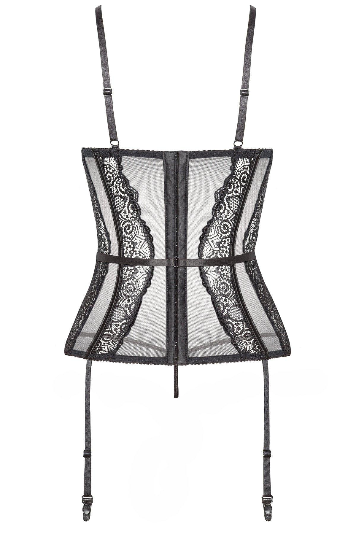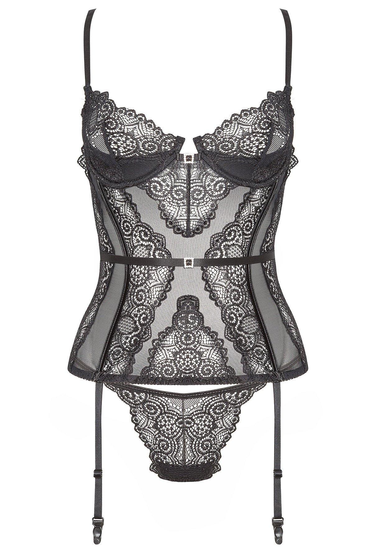 Corsé negro con encaje y tul que realza la silueta con elegancia y sensualidad. Copas con relleno, detalles brillantes y tanga a juego. Perfecto para noches especiales.