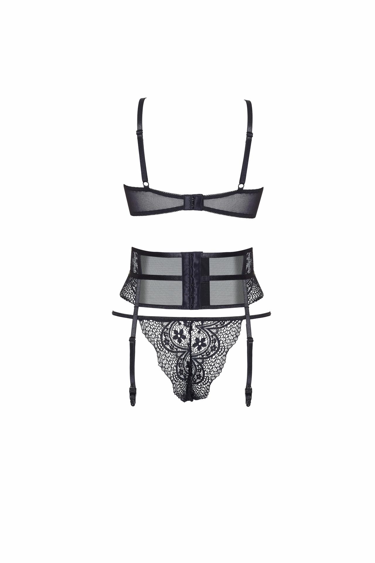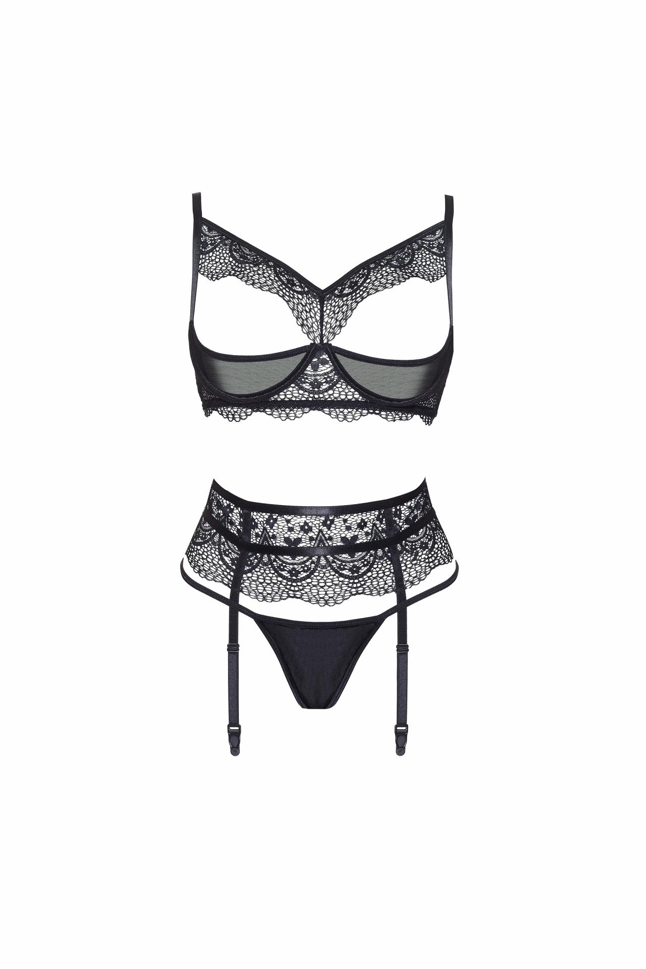 Conjunto de lencería de encaje con copas abiertas, liguero y tanga. Un diseño atrevido y elegante que realza el cuerpo con sensualidad extrema.