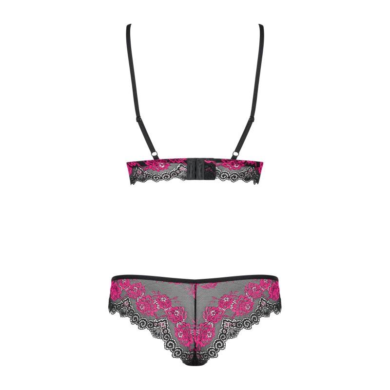 Conjunto negro y fucsia de encaje con rosas y transparencias sutiles. Copas suaves, tirantes y cierre ajustables, braga ComfyCut con recorte triangular.