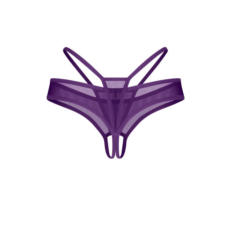 Tanga abierto en malla morada transparente con tiras que realzan caderas y espalda. Dije plateado frontal para un toque brillante y atrevido.