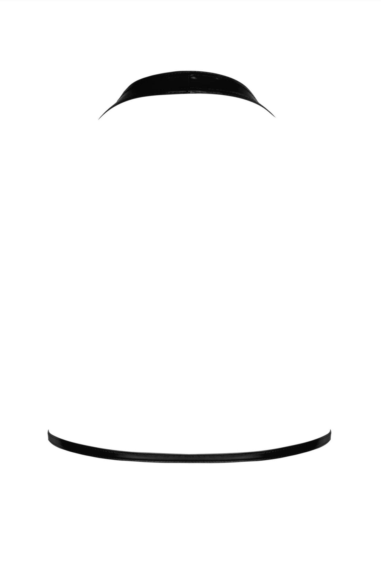 Bralette negro de tejido suave y elástico con efecto cuero, diseño al cuello y cierre frontal. Tirantes decorativos en el busto para un look estructurado y muy llamativo. XS–3XL.