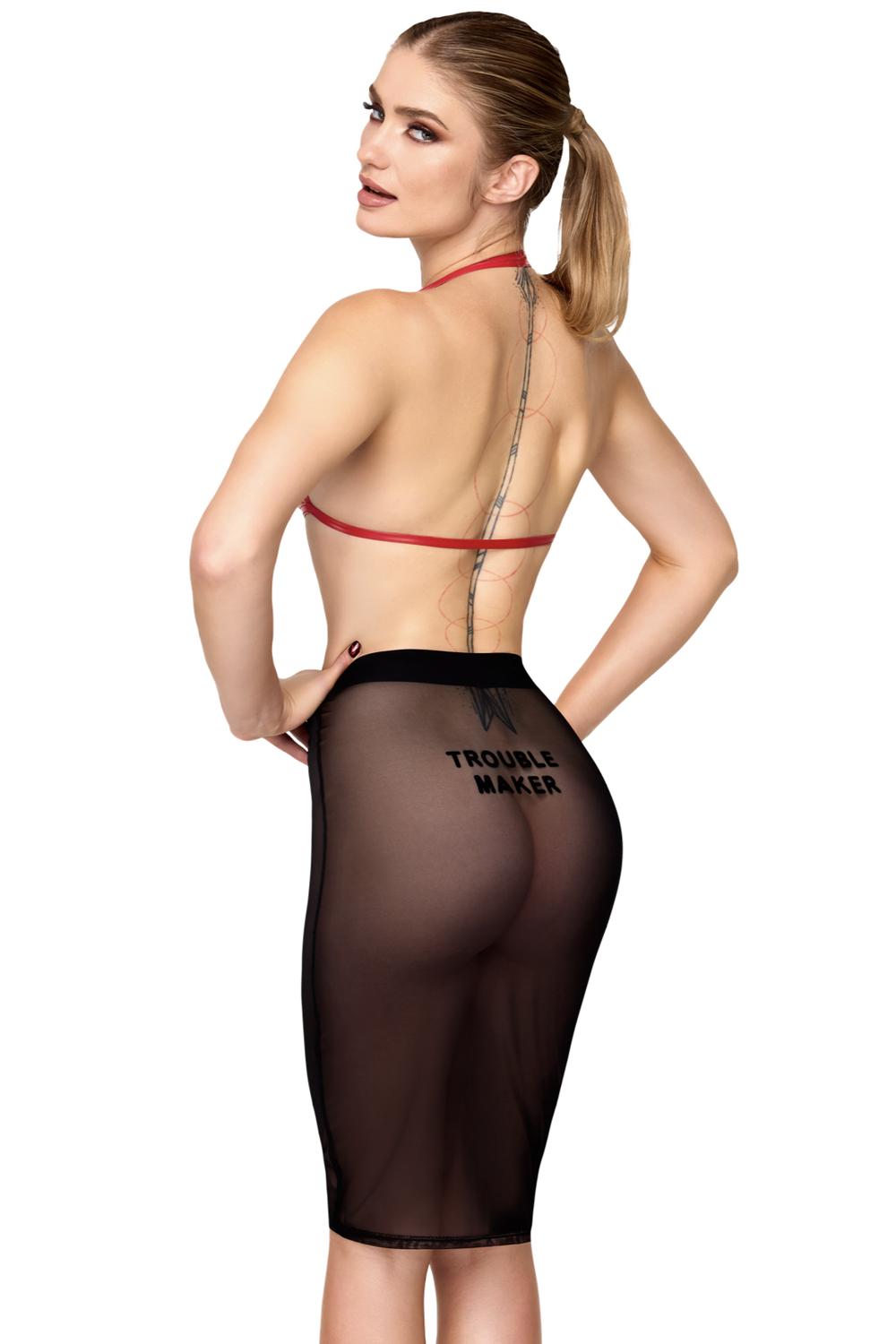 Falda transparente de tul negro elástico con cinturilla ancha y ajuste frontal mediante tira de cuero ecológico. Flocado “TROUBLE MAKER” (traviesa) en la espalda