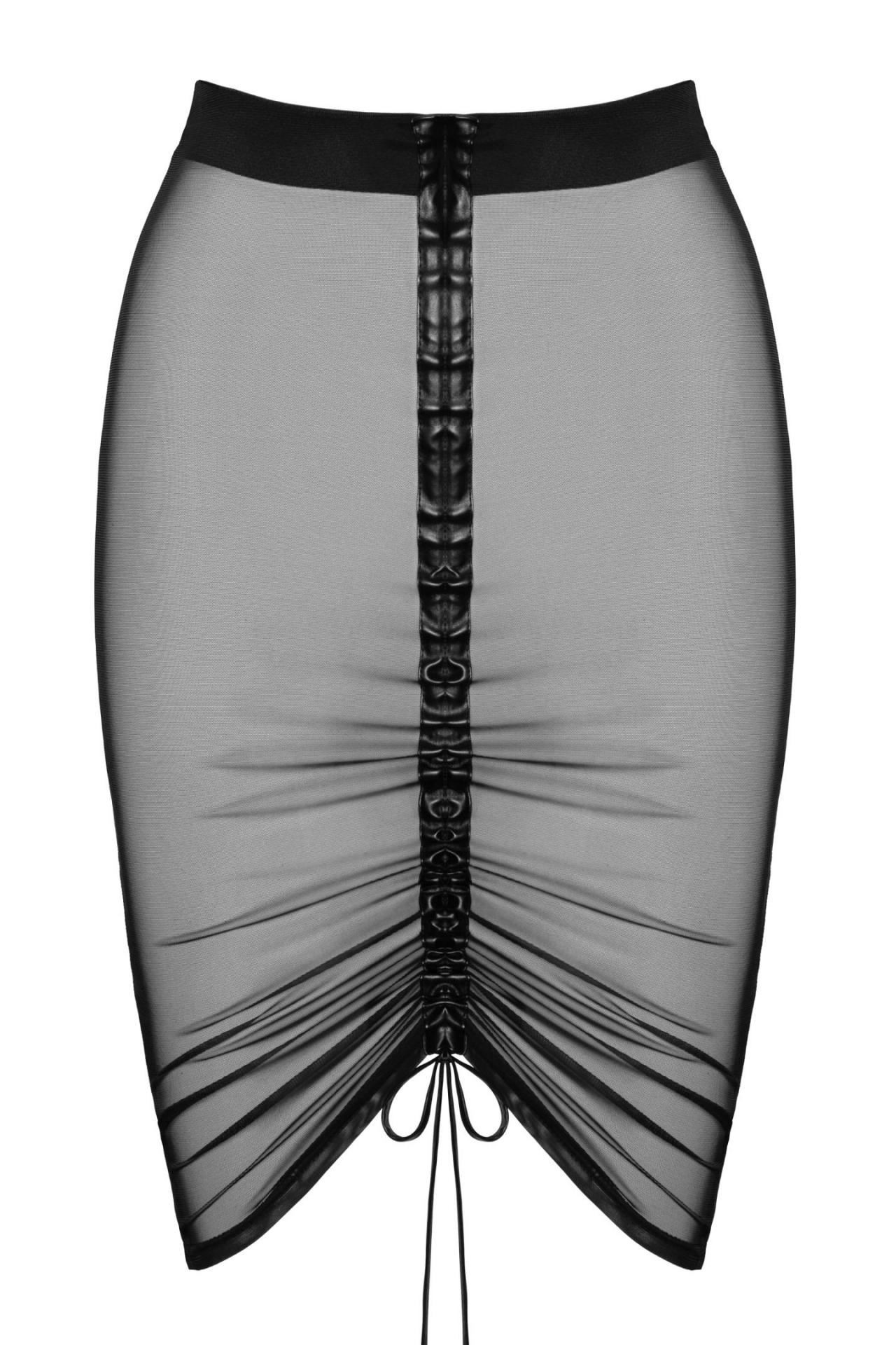 Hay prendas que insinúan… y otras que dominan la escena. Esta falda transparente de tul negro está diseñada para jugar con la mirada: sensual, elegante y con un efecto “wow” que transforma cualquier conjunto en una declaración. Ideal para llevar sobre tu lencería favorita y crear un look irresistible, con ese punto de misterio que deja con ganas de más. El tul elástico suave se adapta al cuerpo como una segunda piel, mientras la cinturilla elástica ancha aporta seguridad y un acabado pulido en la cintura. El detalle protagonista es la tira frontal de cuero ecológico, que te permite ajustar el largo y crear frunces a tu gusto: más corta y atrevida o más larga y sugerente. En la parte trasera, el estampado flocado “TROUBLE MAKER” da un tono juguetón, pone la guinda perfecta: un mensaje que lo dice todo sin explicarlo.
